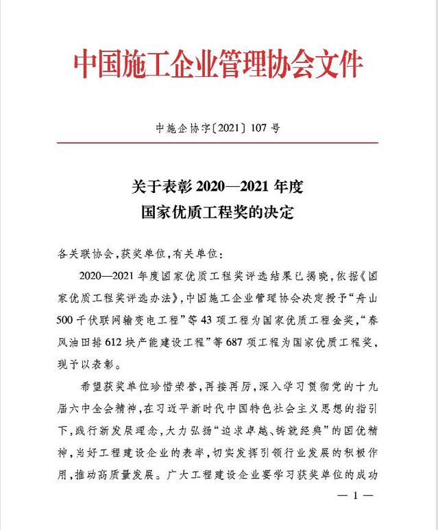 2021年12月6日,中國施工企業(yè)管理協(xié)會公布2020-2021國家優(yōu)質(zhì)工程獎獲獎名單,河西集團新城公司所屬南京河西工程項目管理有限公司代建的招商銀行南京分行招銀大廈項目喜獲該獎項。國家優(yōu)質(zhì)工程獎設立于1981年,是經(jīng)國務院確認的我國工程建設領(lǐng)域設立最早,規(guī)格最高,跨行業(yè)、跨專業(yè)的國家級質(zhì)量獎。