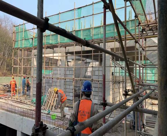 在紫金山莊配套設施擴改建項目現(xiàn)場,聽到的是機器轟鳴、車輛喧囂的聲音,看到的是工作忙碌、干勁十足的景象,工人們正加緊二次結(jié)構(gòu)的施工。