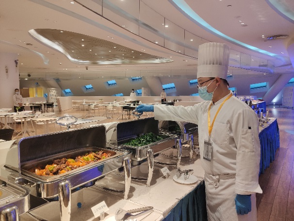 酒店為迎接大會接待任務(wù),早部署早安排,第一時間籌建大會專項服務(wù)組與服務(wù)大使團隊,與大會各工作組細(xì)致對接,針對會議期間的防疫要求、接待動線、住宿安排、會議用餐等方面研究制定出“會議閉環(huán)”專項方案,將會議中心、酒店大堂及客房樓層劃入閉環(huán)管理。
