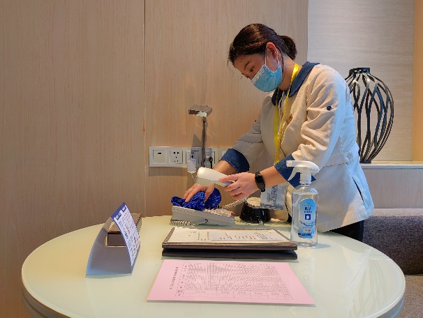 面對會議期間高頻次的清掃量、大量的房內(nèi)物資配備以及住店客人們的各樣需求,客房服務(wù)員們都能做到忙而不亂,將最好的房態(tài)呈獻給會議代表,讓他們感受家一般的溫馨。PA也加強對公共區(qū)域的衛(wèi)生清潔,保證酒店整體清潔舒適。