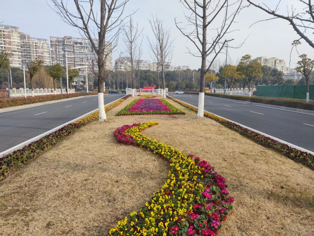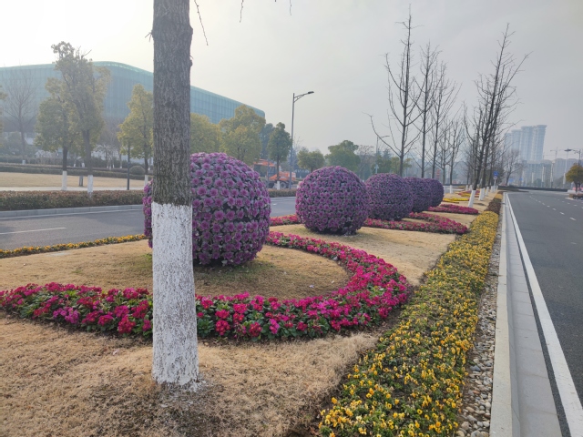 南京奧體中心北門夢都大街人行道旁新增設(shè)一組 “歡度新春”花境式小品生態(tài)微景觀,深紫色羽衣甘藍與黃色三色堇植物的搭配,簡潔明了,“鯉魚躍龍門”小品和“歡度新春”字樣的組合營造出濃濃的年味。道路中分帶的花球換上了“新裝”,4個巨大的羽衣甘藍花球在太陽下盡情地綻放著,烘托出了冬奧會的隆重氣氛,寓意在歡度新春佳節(jié)之際,祝愿冬奧會的奧運健兒們能夠魚躍龍門創(chuàng)佳績。
