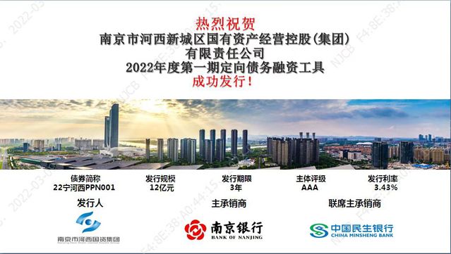 本次債項發(fā)行在主承銷商南京銀行,聯(lián)席承銷商中國民生銀行的共同努力下成功首發(fā)12億元(債券簡稱:22寧河西PPN001)。