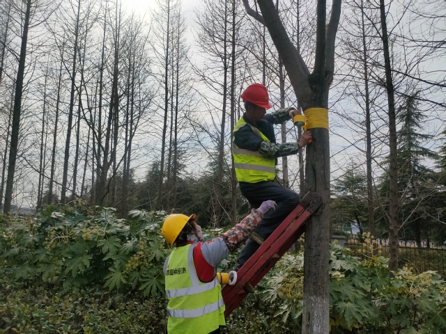 這項舉措不僅可以大大降低綠化養(yǎng)護成本,并且還不存在農藥殘留,不污染環(huán)境。目前公司綠化養(yǎng)護人員已經(jīng)對嗇園路83株欒樹、蒼山路的20余株紫葉李進行了膠帶黏蟲實驗,后期公司將持續(xù)進行觀察,來檢驗其防治效果,為后期開展病蟲害防治提供寶貴的科學依據(jù)。